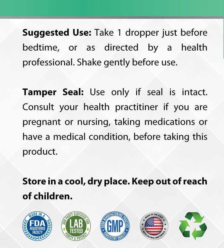 Suggested Use: Shake well. Take 1–2 droppers (1–2mg or per serving size) under the tongue 20–30 minutes before bedtime, or as directed by your healthcare provider.